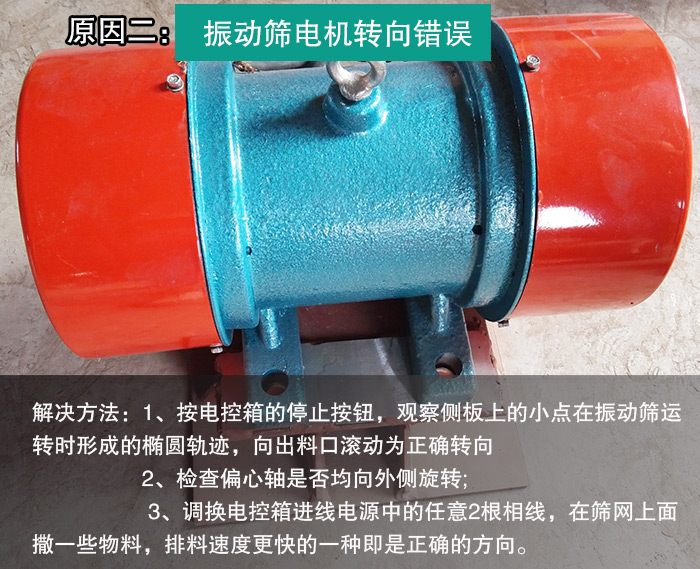 解决方法:1、振动筛筛箱运转时,按电控箱的停止按钮,此时振动筛会慢慢停下来,观察侧板上的小点在振动筛运转时形成的椭圆轨迹,向出料口滚动为正确转向;