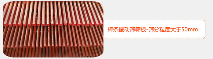 棒条振动筛筛板是由一组平行排列的、具有一定断面形状的钢棒组成。棒条平行排列,棒条之间的间隔即为筛孔尺寸。棒条筛面一般用于固定筛或重型振动筛,适于筛分粒度大于50mm的粗粒级物料。