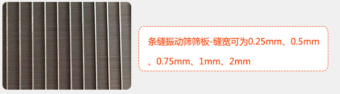 条缝振动筛筛板用不锈钢作筛条制成,有穿条式、焊接式和编织式三种结构型式。条缝振动筛筛板的筛条断面形状为圆形,缝宽可为0.25mm、0.5mm、0.75mm、1mm、2mm等。条缝振动筛筛板适用于对中细粒级的脱水、脱介和脱泥作业。